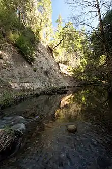 Pescadero Creek is a major stream in Santa Cruz and San Mateo counties in California, United States. At 26.6 miles (42.8 km),[2] it is the longest stream in San Mateo County and flows all year from springs in the Santa Cruz Mountains.[3] Its source is at 1,880 feet (570 m) above sea level on the western edge of Castle Rock State Park, with additional headwaters in Portola Redwoods State Park, and its course traverses Pescadero Creek County Park and San Mateo County Memorial Park before entering Pescadero Marsh Natural Preserve at Pescadero State Beach and thence to the Pacific Ocean 14.4 miles (23 km) south of Half Moon Bay.