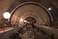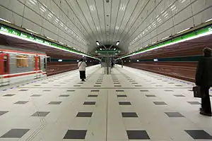 The station's tunnel is the largest underground construction on the Prague Metro,[2] at 217m long, 16m high and 22m wide, located 40m below the surface.[3] The station was designed by architect Jiří Pešata.[4]