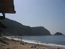 The beach is set at the base of a very steep road, surrounded by mountains, in a curved bay with a strip of pebble and sand beach which is up to 50M wide in places. The beach is about 600M long, with the central part being used by swimmers.