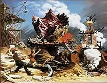 Blume's works often portrayed destruction and restoration simultaneously.[1] Stones and girders made frequent appearances; The Rock (1944–1948), today in the collection of the Art Institute of Chicago, was interpreted by its viewers as symbolizing renewal in the wake of World War II. Recollection of the Flood (1969) depicted the victims of the 1966 Flood of the River Arno in Florence along with restorers at work. The Metamorphoses (1979) invoked the Greek legend of Deucalion and Pyrrha, who repopulated the earth after a deluge.[1]