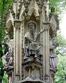 In 1855 Peter Fuchs returned to Cologne, where he created such large sandstone reliefs and statue groups as the Four Prophets (1858) for the Mariensäule in the Gereonsdriesch and the life-size figures of SS Dionysius and Reinold (1866–1871) for the west front of St. Mauritius.