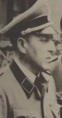 On 27 April 1945, Högl was sent out from the Chancellery to find Heinrich Himmler's liaison man in Berlin, SS-Gruppenführer and Generalleutnant of the Waffen-SS Hermann Fegelein who had abandoned his post at the Führerbunker.[5] Fegelein was caught by the RSD squad in his Berlin apartment, wearing civilian clothes and preparing to flee to Sweden or Switzerland. He was carrying cash—German and foreign—and jewellery, some of which belonged to Eva Braun. Fegelein was intoxicated when arrested by Högl and brought back to the Führerbunker where he was kept in a makeshift cell.[5] The following evening, Hitler was informed of the BBC broadcast of a Reuters news report about Himmler's attempted negotiations with the Western Allies via Count Folke Bernadotte of Sweden.[6] Hitler in a rage ordered Himmler's arrest.[7] Further, a military tribunal was ordered by Hitler to court-martial Fegelein. Waffen-SS General Wilhelm Mohnke presided over the tribunal which included Generals Rattenhuber, Hans Krebs and Wilhelm Burgdorf. Although he was certain Fegelein was "guilty of flagrant desertion", Mohnke persuaded his fellow judges to close the proceedings and turned the defendant over to General Rattenhuber and his security squad. Mohnke never saw Fegelein again.[8]