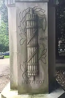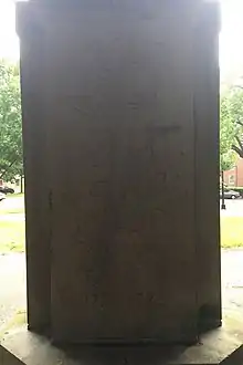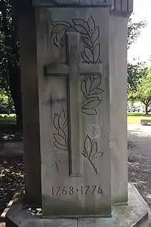 The bronze bust of Muhlenberg sits atop a limestone base. The approximately 4 feet (1.2 m) high by 4 feet (1.2 m) wide sculpture depicts Muhlenberg in civilian dress, with his hands resting on an open Bible before him. The base, which stands approximately 8 feet 2 inches (2.49 m) tall, resembles a pulpit and features, on three sides, carvings representing Muhlenberg's contributions to his country as a Clergyman, Soldier, and Statesman.[26][37] The Clergyman side features an image of a Latin cross and the years, "1768–1776" inscribed below it. The Soldier side features an image of a saber and the years, "1774–1783." The Statesman side features an image of a fasces and the years, "1787–1807." The inscription at the front of the base reads: "JOHN PETER GABRIEL MUHLENBERG, 1746–1807; Serving HIS CHURCH, HIS COUNTRY, HIS STATE." A rectangular concrete exedra with three plaques, each containing biographical information about Muhlenberg, flanks the rear and sides of the memorial.[22][26][37]
