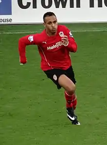 On 2 September 2013, Odemwingie signed a two-year contract with Cardiff City for £2.25 million.[55] Speaking after the move Odemwingie stated that he was eager for a fresh start in his career.[56] He made his debut on 22 September 2013 in a 1–0 defeat against Tottenham Hotspur.[57] He scored his first goal for the club two days later in a 3–2 defeat against West Ham United in the League Cup.[58] He also scored in a 2–1 loss against Newcastle United on 5 October 2013.[59] He developed a good relationship with manager Malky Mackay who stated that Odemwingie "is a joy to work with".[60][61] However Mackay was replaced with Ole Gunnar Solskjær in January 2014 and Odemwingie fell out of favour.[62]