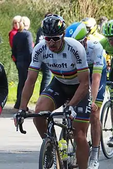 Sagan started his season at the Tour de San Luis, taking his first podium place of the year on Stage 2 by finishing second.[166] In February, after a three-week training camp in Spain's Sierra Nevada, he competed in the opening races of the Belgian classics season, finishing second in Omloop Het Nieuwsblad and seventh in Kuurne–Brussels–Kuurne.[167] He then came in fourth at the Strade Bianche, being part of the four-man decisive move, but was dropped on the final climb to Siena.[168] He took part in Tirreno–Adriatico, where he finished second overall, one second behind Greg Van Avermaet, and also won the points classification.[169] Sagan claimed his eighth second-place finish following his World Championship win at E3 Harelbeke, before taking his first win as world champion at Gent-Wevelgem,[170] becoming the first reigning world champion to win the race since Rik Van Looy in 1962.[171] Upon his win at Gent–Wevelgem, Sagan became the number one-ranked rider in the UCI Men's road racing world ranking.[172]