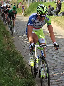 Sagan started his season at the Tour of Qatar, taking his first podium spots with second-place finishes on stages four,[124] and five,[125] and won the young rider classification.[126] After a winless Tour of Oman, Sagan finished second on the first two road stages of Tirreno–Adriatico.[127][128] On Stage 6, Sagan took his first win in Tinkoff–Saxo colours in a rainy, flat stage.[129] He finished the race as winner of the points classification.[130] He sprinted to fourth place at Milan–San Remo,[131] while at E3 Harelbeke, Sagan got clear of the main group with Geraint Thomas and Zdeněk Štybar on the Oude Kwaremont with 41 kilometres (25 miles) left, but faded to 30th following Thomas' attack with 4 kilometres (2.5 miles) to go.[132] He finished tenth at an attritional Gent–Wevelgem,[133] before a fourth-place finish at the Tour of Flanders, after he faded in the closing kilometres.[134] At Paris–Roubaix, he was in a group chasing the leaders, but lost time following a mechanical and subsequent bike change, ultimately finishing 23rd.[135]