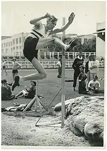 Two weeks later, Wells and Pavitt competed for the Southern Counties in an inter-area match at St. George Grammar School playing fields at Whitehall, Bristol. Jumping off his preferred grass take-off area, Wells re-took the English Native high jump record with a jump of 6 ft. 6⅜in (1.99m).[13][14] This jump was higher than the gold medal jump at the 1948 Summer Olympics in London the previous year.[19] This record was not beaten until 30 April 1959, when the Hermes Club jumper, G.A.Miller, against Oxford University, cleared 6 ft 7.25 in (2.01 m) .[20]