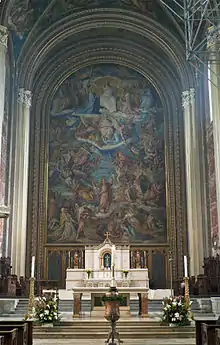 The fresco decorations of the Ludwigskirche in Munich, which were for the most part designed and executed by Cornelius, were perhaps the most important mural works of their time. The large fresco of the Last Judgment, over the high altar in that church, measures 62 feet (19 m) in height by 38 feet (12 m) in width. The frescoes of the Creator, the Nativity, and the Crucifixion in the same building are also upon a large scale. Other major works in Munich included his decorations in the Pinakothek and in the Glyptothek; those in the latter building, in the hall of the gods and the hall of the hero-myths, are perhaps the best known. In about 1839–40 he left Munich for Berlin to work on a series of cartoons, depicting the Apocalypse, for a cycle of frescoes commissioned by Frederick William IV for a proposed "Campo Santo" or royal mausoleum in Berlin.[2] The king abandoned his plans following the revolution of 1848, but Cornelius continued to work on the cartoons for the rest of his life.[5]