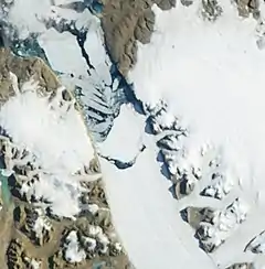 A series of satellite images from 2002 through 2009 illustrate that the terminus of the glacier has advanced towards the ocean, however, several lateral rifts have developed also. The distance of this rifts or cracks back from the terminus has diminished for this time period also and may serve as a precursor to natural ice calving from Petermann Glacier.[6] A large chunk estimated to be 100 square miles (260 km2) calved off the glacier[7] in August, 2010. The Danish Meteorological Institutes maintains an archive of imagery of Petermann Glacier and adjacent coastal areas of Greenland[8][9] from both European and US satellites and sensors such as Envisat, MODIS, and AVHRR.