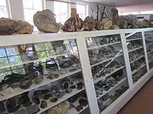 The 4-acre (1.6 ha) grounds also contain roaming peafowl and a small museum with a gift shop that sells rocks,[3][8] including crystals, fossils and semiprecious gemstones.[6] The museum features a fluorescent room with miniature castles constructed from manganese, tungsten, uranium and zinc that glow in the dark.[6] Petersen Rock Garden is open every day from 9 a.m. until closing time, which varies depending on the season.[9] Admission was $4.50 for adults, at self-pay stations, as of 2009.[3] It is not a member of the Oregon Museums Association.[10] The price had increased to $6 by 2016.[11]
