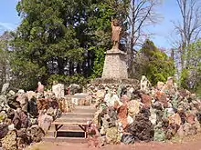 Petersen Rock Garden, considered a roadside attraction with "eclectic" novelty architecture,[4][5] is located 3 miles (4.8 km) off U.S. Route 97, 10 miles (16 km) north of Bend and 7 miles (11 km) south of Redmond.[6] It contains dozens of "fanciful" and "intricately detailed" miniature buildings,[7] including castles, churches and cottages,[3] constructed from agate, jasper, lava, malachite, obsidian, petrified wood and thundereggs.[3][8]