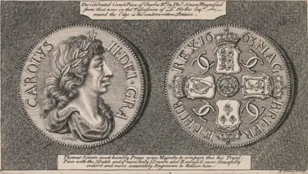 Simon's coin shows the bust of King Charles II draped in his flowing hair and laurel leaves, with his celebrated lovelock over his right shoulder. The intricacy of the engraving portrays even the shadows of the King's veins on his neck. The inscription reads CAROLVS II. DEI. GRA and on the reverse are crowned cruciform shields of England, Scotland, Ireland and France, with the order of the Garter at the centre. There are two C's interlinked in each angle. The reverse of the coin is slightly convex and the obverse concave to show the King as a stronger feature of the coin. Ultimately however the Roettier brothers continued to produce the dies for the crowns, albeit from 1664 with subtle corrections as a result of the influence of Simon's pattern.