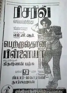 Petralthan Pillaiya is based on Charlie Chaplin's 1921 American film, The Kid.[1] Writer Aaroor Dass initially narrated the story to Sivaji Ganesan, who seemed interested but "did not follow up"; he later gave it to M. G. Ramachandran.[5] The duo Krishnan–Panju (R. Krishnan and S. Panju) directed the film, and Panju edited the film under the alias S. Panjabi. It was produced by K. K. Vasu under the banner Sri Muthukumaran Pictures, and photographed by P. N. Sundaram.[4] This is the 25th and final collaboration between Ramachandran and M. R. Radha, as a few days after the film was completed, Radha shot Ramachandran, wounding him.[6]