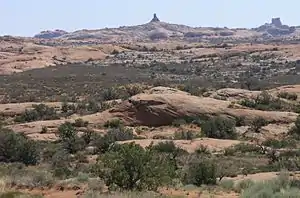 The Petrified Dunes are a series of rock formations located in Arches National Park in southeastern Utah, United States.[1] The dunes can be found just off of the park road between the Courthouse Towers and the Windows Area. The formation was produced when ancient sand dunes hardened into stone under the overlying subsequent material, which later eroded away.[2]