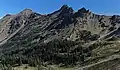 Petunia Peak is set in the northeastern Olympic Mountains, and is situated on the boundary shared by Olympic National Park with the Buckhorn Wilderness, on land partially managed by the Olympic National Forest. Precipitation runoff from Petunia Peak drains into tributaries of the Dungeness River, and topographic relief is significant as the east aspect rises 3,750 feet (1,143 m) above the river in approximately 1.7 mile, and the west aspect rises 2,000 feet above Royal Basin in less than one mile. Old-growth forests of Douglas fir, western hemlock, and western redcedar grow on the lower slopes surrounding the peak. Like the town of Sequim 17 miles to the north, Petunia Peak lies in the rain shadow of the Olympic Mountains. It is also called "Petunia Peaks", as a higher summit known as North Petunia Peak (6,998 ft) rises 0.6 mile (1 km) to the north.[4][5] This landform's name has not been officially adopted by the U.S. Board on Geographic Names, so the mountain is not labeled on USGS maps.