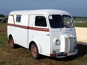The van, based on a wartime design,[2] was relaunched, soon after the Liberation, in June 1946 as the Chenard-Walcker CPV. In this form it was powered by a two-cylinder water-cooled two-stroke engine of just 1,021 cc. Power output of 26 hp was claimed. Accepting that even by the standards of the time, this level of power was insufficient, in 1947 the manufacturers switched to using the 1,133 cc engine of the Peugeot 202, and claimed power increased to 30 hp.