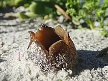 Peziza ammophila is a fungus in the cup fungus genus Peziza. It grows on sand dunes and beaches. As it gets older, it comes out from the sand and splits. It grows spring through winter, and in North America. It is cup shaped. The Dutch call these Zandtulpjes, or "sand tulips."[1]