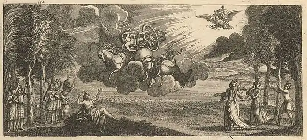 Phaëton, the prideful and reckless son of the Sun and the ocean nymph Clymene, is driven to abandon his lover Theona by his ambition for the hand of Libya, daughter of the king of Egypt. On the day of the wedding, Libya's enraged lover Epaphus, himself the son of Jupiter, disputes Phaëton's claim to divine lineage. Desiring to prove himself, Phaëton convinces his father to allow him to drive the sun-chariot for one day. In the course of his flight he loses control of the horses, threatening the earth beneath with fiery destruction; Epaphus entreats his father to put an end to the danger, and Jupiter strikes the chariot down with a thunderbolt. Phaëton falls to his death.