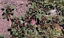 It is an annual herb growing in a small, flat mat or with a short upright stem a few centimeters high. It is blue-green in color, succulent, and lightly hairy. The oval, smooth-edged leaves are one or two centimeters long and borne on short petioles. The hairy inflorescence is a one-sided curving or coiling cyme of several tiny bell-shaped flowers. Each flower is white with lavender veining, about half a millimeter wide and no more than 2 millimeters long.