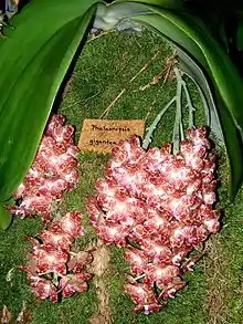 Phalaenopsis gigantea is a species of orchid endemic to the island of Borneo and was first described in 1909. The specific epithet gigantea refers to the giant size of its leaves, which can grown over 60 cm in length on a mature plant. It is the largest known Phalaenopsis species.[2]