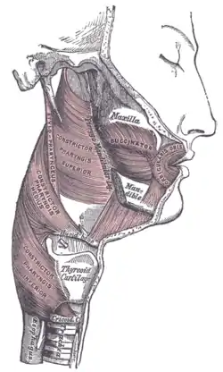 The pharyngeal muscles are a group of muscles that form the pharynx, which is posterior to the oral cavity, determining the shape of its lumen, and affecting its sound properties as the primary resonating cavity.