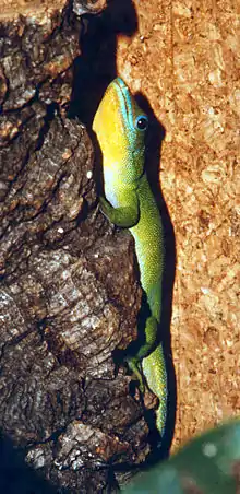 The yellow-throated day gecko (Phelsuma flavigularis) is an endangered diurnal species of gecko from eastern Madagascar. It typically inhabits rainforests and dwells on trees. The yellow-throated day gecko feeds on insects and nectar.