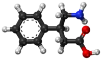 Phenibut is a derivative of the inhibitory neurotransmitter GABA.[5] Hence, it is a GABA analogue.[5] Phenibut is specifically the analogue of GABA with a phenyl ring substituted in at the β-position.[5] As such, its chemical name is β-phenyl-γ-aminobutyric acid, which can be abbreviated as β-phenyl-GABA.[5] The presence of the phenyl ring allows phenibut to cross the blood–brain barrier significantly, unlike the case of GABA.[5] Phenibut also contains the trace amine β-phenethylamine in its structure.[5]