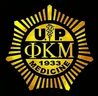 A seven-cornered golden sunburst with the Greek letters ΦΚΜ across the middle. Above it is the staff of Aesculapius flanked by the letters U and P which stand for The University of the Philippines. Below the Greek letters is the year the Fraternity was founded - 1933 and the name of the College of Medicine.