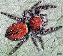 Phidippus cardinalis is a species of jumping spider. It is commonly called cardinal jumper. It is one of the species of jumping spiders which are mimics of mutillid wasps in the genus Dasymutilla (commonly known as "velvet ants"); several species of these wasps are similar in size and coloration to the spiders, and possess a very painful sting.