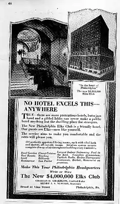 Philadelphia Lodge No. 2 BPOE, also known as the Philadelphia Athletic Club, was a historic Benevolent and Protective Order of Elks (BPOE) lodge occupying 306-320 N. Broad Street in the Logan Square neighborhood of Center City Philadelphia. The lodge, built between 1922 and 1925, was a 13-story building. The BPOE moved into the new lodge from the 4-story building at 1320–1322 Arch Street, built in 1904–1906 and designed by Francis Caldwell and Edward Simon, that still stands.[2][3]