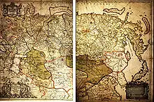 As part of his book, Strahlenberg and Johan Anton von Matérn drew new maps of all of Russia - a formidable task in itself. He also suggested a new border between the continents of Europe and Asia in Russian territory. This border follows the peaks of the Urals, then branches off westwards along a minor mountain range, follows the hilly west bank of Volga river downstream to the 49th degree of latitude and Don river thereon to the Black Sea.[1] Vasily Tatischev claimed that it was at his suggestion that Strahlenberg adopted the idea.[2] See Boundaries between continents for the current political and geographical debates about the Europe-Asia border.