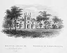 This Philip St. George Cocke owned large plantations in several Virginia counties, including Powhatan, Surry and Brunswick Counties, as well as cotton plantations in Mississippi. He used enslaved labor on all his plantations. In 1835, Philip St. George Cocke commissioned architect A.J. Davis to build a manor house named "Belmead" in Powhatan County.[4] In 1840, Cocke owned 30 slaves in Surry County, 125 slaves in Brunswick County and 82 slaves in Powhatan County.[5] The numbers grew by 1850 to 118 slaves in Powhatan County, 45 in the southern district of Brunswick County, and 187 slaves in Lowndes County, Mississippi.[6] In 1860, Cocke owned 124 slaves in Powhatan County, at least 33 in Yazoo County, Mississippi and possibly another 39 in Holmes County, Mississippi and 52 in Fluvanna County, Virginia.[7]
