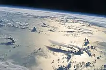 The Philippine Sea is a marginal sea of the Western Pacific Ocean east of the Philippine archipelago (hence the name), the largest in the world, occupying an estimated surface area of 5 million square kilometers (2×106 sq mi).[1] The Philippine Sea Plate forms the floor of the sea.[2] Its western border is the first island chain to the west, comprising the Ryukyu Islands in the northwest and Taiwan in the west. Its southwestern border comprises the Philippine islands of Luzon, Catanduanes, Samar, Leyte, and Mindanao. Its northern border comprises the Japanese islands of Honshu, Shikoku and Kyūshū. Its eastern border is the second island chain to the west, comprising the Bonin Islands and Iwo Jima in the northeast, the Mariana Islands (including Guam, Saipan, and Tinian) in the due east, and Halmahera, Palau, Yap and Ulithi (of the Caroline Islands) in the southeast. Its southern border is Indonesia's Morotai Island.[3]