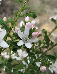 Philotheca verrucosa, commonly known as fairy wax-flower or Bendigo wax-flower,[2] is a species of flowering plant in the family Rutaceae and is endemic to south-eastern Australia. It is a small shrub with prominently glandular-warty branchlets, heart-shaped or egg-shaped leaves with the narrower end towards the base, and white flowers usually arranged singly in leaf axils.