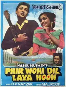 Phir Wohi Dil Laya Hoon (transl. I've come back with the same heart) is a 1963 Indian Hindi-language film. The film became superhit at the box office. [1] This was Nasir Hussain's second production (his first in colour), after the hit film Jab Pyar Kisi Se Hota Hai (1961). He also wrote and directed it. It starred Joy Mukherjee and the Nasir Hussain fixture Asha Parekh. Pran played the villain in the film and Rajindernath had a supporting role. It also contains many songs that Mohammed Rafi sang beautifully.
