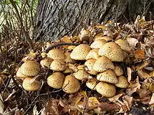 Pholiota flammans, commonly known as the yellow pholiota, the flaming Pholiota, or the flame scalecap, is a basidiomycete agaric mushroom of the genus Pholiota. Its fruit body is golden-yellow in color throughout, while its cap and stem are covered in sharp scales. As it is a saprobic fungus, the fruit bodies typically appear in clusters on the stumps of dead coniferous trees. P. flammans is distributed throughout Europe, North America, and Asia in boreal and temperate regions. Its edibility has not been clarified.
