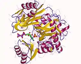 As of late 2007, 3 structures have been solved for this class of enzymes, with PDB accession codes 1GSO, 1VKZ, and 2QK4. The overall structure of the enzyme, based on crystallization from E. coli,[7] consists of 16 alpha helices which connect to 20 beta strands by turns and loops. There are four main domains: N, A, B, and C. Each domain has a central beta sheet with an alpha helix on at least one side. The N, A, and C domains are clustered together, while the B domain is slightly separated from the others and connected to them by two hinge regions. The active site is between the NAC group and the B domain. The A and B domains appear to facilitate ATP binding, while the N and C domains confer substrate specificity. The N domain is very similar to that of glycinamide ribonucleotide transformylase. Although the orientation of the B domains varies, the structure of GARS is very similar across organisms.[4] Furthermore, the gene has been sequenced in many organisms, and E. coli shows between 41 and 52% identity with the GARS sequences of B. subtilis, S. cerevisiae, D. melanogaster, and D. pseudobscura.[8] Human GARS-AIRS-GART has been shown to be most similar to that of mice, chimpanzees, and cows.[9] Among the amino acids that are identical in B. subtilis, S. cerevisiae, D. melanogaster, and D. pseudobscura, almost a third are glycine and proline, which suggests that they play an important role in proper folding of the protein.[8] In addition to similar structure across species, GARS as a whole has a very similar structure to D-alanine:D-alanine ligase, biotin carboxylase, and glutathione synthetase. All of these enzymes have an ATP binding domain classified as ATP-grasp domains.[4]