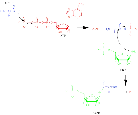 GARS operates via an ordered, sequential mechanism. 5-phospho-D-ribosylamine (PRA) binds first, then ATP, and finally glycine. Phosphate is released first, followed by ADP and GAR.[4] The oxygen in the ribose ring of PRA is important in substrate binding, likely due to favorable energetics from hydrogen bonding and the ring conformation it confers.[5] In addition, the phosphate group of GAR has been implicated in GARS substrate recognition. The reaction starts with the oxygen of glycine acting as a nucleophile to attack the γ-phosphorus of ATP. Then, the nitrogen of PRA attacks the carbonyl carbon in the intermediate, and phosphate leaves, forming GAR.[4][6]