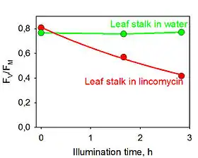 Photoinhibition follows simple first-order kinetics if measured from a lincomycin-treated leaf, cyanobacterial or algal cells, or isolated thylakoid membranes in which concurrent repair does not disturb the kinetics. Data from the group of W. S. Chow indicate that in leaves of pepper (Capsicum annuum), the first-order pattern is replaced by a pseudo-equilibrium even if the repair reaction is blocked. The deviation has been explained by assuming that photoinhibited PSII centers protect the remaining active ones.[24] Both visible and ultraviolet light cause photoinhibition, ultraviolet wavelengths being much more damaging.[12][23][25] Some researchers consider ultraviolet and visible light induced photoinhibition as a two different reactions,[26] while others stress the similarities between the inhibition reactions occurring under different wavelength ranges.[12][13]