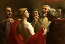 Phryne was largely ignored during the Renaissance, in favour of more heroic female figures such as Lucretia, but interest in her story increased towards the end of the eighteenth century. Early depictions of her by Angelica Kauffmann and J. M. W. Turner avoid eroticising her, but in the latter half of the nineteenth century, French academic painters focused more on the eroticism of Phryne's life.[28] The most famous nineteenth century depiction of Phryne was Jean-Léon Gérôme's Phryne before the Areopagus, which was controversial for showing her covering her face in shame, in the same pose that Gérôme used in several paintings of slaves in Eastern slave-markets.[29] Driven by this controversy, Gérôme's painting was widely reproduced and caricatured, with engravings by Léopold Flameng, a bronze by Alexandre Falguière, and a painting by Paul Cézanne all modelled after Gérôme's Phryne.[30] In nineteenth century literature, Phryne appears in "Lesbos" from Baudelaire's Les Fleurs du Mal, where she is used metonymically to represent courtesans in general, and in Rainier Maria Rilke's Die Flamingos, in which rather than seducing the men around her, she narcissisticly seduces herself.[31]