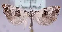 The wingspan is 14–17 mm. The ground colour of the wings is white with a red-brown apical spot and blackish and metallic-grey markings.