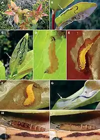 A Leaf mines of young growing Gaiadendron shoot B mature mine with pupal cocoon fold (arrow) C nearly mature mine and mature sap-feeding larva (left arrow), and oviposition location (right arrow) D close-up view of mature sap-feeding larva E openede mine showing mature sap-feeding larva in situ F opened young pupal cocoon fold showing cocoon-spinning larva in situ G pupal cocoon fold, arrow pointing at thinner pupal exit H opened pupal cocoon fold showing pupa in situ, dorsal view I pupa in situ, lateral view.