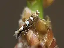 The wingspan is about 8 millimetres (0.31 in). Adults are on wing in May and again in August in two generations per year.[2]