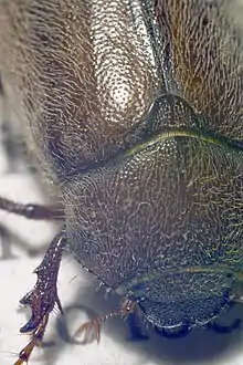 Phyllophaga is a very large genus (more than 900 species) of New World scarab beetles in the subfamily Melolonthinae. Common names for this genus and many other related genera in the subfamily Melolonthinae are May beetles, June bugs, and June beetles.[1][2] They range in size from 12 to 35 mm (0.47 to 1.38 in)[1][2] and are blackish or reddish-brown in colour, without prominent markings, and often rather hairy ventrally. These beetles are nocturnal, coming to lights in great numbers.