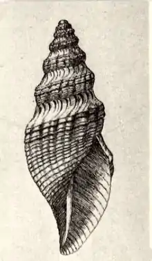 (Original description) The fusiform shell is rather large, rather thin, translucent white with very little lustre. It has a high, regularly tapered spire of six obtusely shouldered whorls, not counting the protoconch which is broken off, and a long, nearly straight columella and a broad, straight aperture occupying about half the length of the shell. The posterior sinus is as broad as the subsutural band, shallow, slightly broken. The outer lip is thin, curving very gently to join the columella with but a very slight bending in anteriorly, not forming a well-defined siphonal canal. The columella shows a thin, narrow strip of enamel extending its entire length. The suture is inconspicuous. The subsutural band is rather broad, oblique, crossed by delicate slightly curved riblets, most distinct on the upper whorls. Narrow, oblique, angular ribs, fifteen on the body whorl, separated by rather deep, narrow spaces, cross the whorls, rising just above the periphery and not quite reaching to the suture. These are cut just above the middle by a broad, shallow groove, making them appear, especially on the body whorl, as two rows of nodules. In some positions of the shell there seems to be a second similar groove (scarcely discernible) below this one. The spiral sculpture is very irregular. On the body whorl, below the transverse ribs, there are from twenty-five to thirty shallow grooves, varying in width, and having between them flattened bauds or threads. On the siphonal canal they are so close together that their interspaces appear like rounded threads. Above these, about the middle of the whorl, they are very broad, and separated by equally broad flattened bands, while still above these, below the ribs, they are again narrowed and separated by flattened threads. On the ribs the grooves also vary considerably. On each side of the principal groove, a rather broad, flattened thread forms a slight crest on the summit of the ribs, and beyond the lower one of these there are two or three fine rounded threads. The principal groove is also interrupted by a rounded thread at about the middle, and two or three very faint ones above and below it. On the upper part of the ribs there are two or three unequal grooves. On the penultimate whorl there are four grooves below the principal one, separated by nearly equal spaces, with but a single rounded thread on the centre of the first or principal one. With the exception of the subsutural band, the surface is covered with microscopic striae, which, in intersecting the inconspicuous lines of growth, give a peculiar crinkled appearance to the surface. [2]