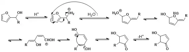 It was proposed by Piancatelli that the reaction is a thermal electrocyclic reaction of a conrotatory 4π electron system while studying specifics of the mechanism conditions when synthesizing the 4-hydroxycyclopentenone derivatives. This mechanism was suggested when studying 1H NMR spectra as it became apparent that the final products exclusively delivered the trans isomer.[1]