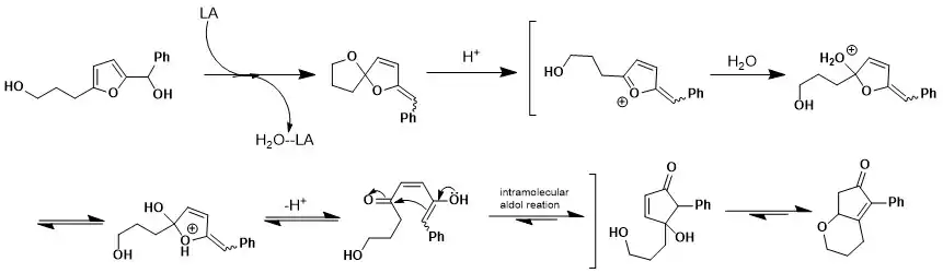 Another proposed mechanism is from Yin and co-workers that was studied while completing the rearrangement of 2-furylcarbinols with a hydroxyalkyl chain at the 5 position. Yin rationalized the mechanism by utilizing an aldol-type intramolecular addition.[1]