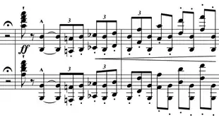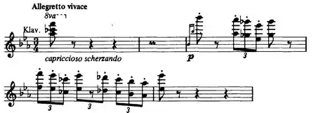 The orchestra introduces the main theme of the piece with a powerful motif.[1] A story exists that, to mock his critics, Liszt and his son-in-law, Hans von Bülow, put the words Das versteht ihr alle nicht, haha! (none of you understand this, ha-ha) to the notes of the opening two bars.[2] The piano then comes in with an octave passage, spanning four octaves. A duet ensues between the piano and the clarinet in a quiet and peaceful passage, which is soon taken over again by the main theme. Following this, the piano plays fast, downward chromatic octaves, before recapitulating a section from earlier in the movement, this time in G major. The movement finishes with the main theme played by the strings while the piano imitates a harp with fast, quiet arpeggios, culminating with an upwards chromatic scale in sixths, diminishing to ppp volume.