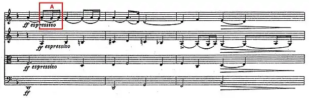 The three notes at A, above, recur during the movement as a motif, and are heard again in the slow movement.[18] The themes are developed, with constant harmonic changes, and the movement ends gently after a coda using a new theme derived from both the first and second.[19] The tempo marking for the movement in the published score is crochet=69, which Nichols suggests is a misprint for crochet=96, which is closer to the tempo usually adopted.[16]