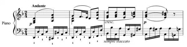 The Andante movement is in D minor. The primary feature is the staccato semiquaver bass. There is a slight diversion in the tonic major involving dialogue between a dotted, staccato rhythm and a set of semiquaver triplets. It then returns to the primary melody.